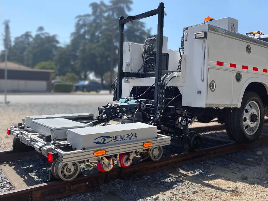 The OKOSCAN UT 73HS PICKUP is a high-speed ultrasonic (UT) rail testing System for railway tracks. It is integrated with the customer's high-rail vehicle, a Ford F350 XL (SUPER DUTY), and allows testing to be conducted at speeds of up to 40 km/h.