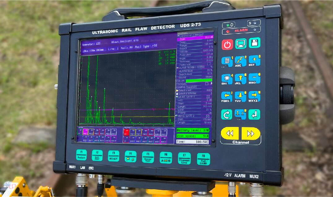 The UDS2-73 SWP ultrasonic rail flaw detector is intended for continuous, mechanized rail testing of railway tracks, including turnouts (crossings and frogs), at speeds of up to 5 km/h. The trolley detects defects in both rails along the full length of the track and throughout the rail cross-section, except for the foot flanges. It also enables manual confirmatory testing of specific rail cross-sections and weld joints, determines the parameters of detected defects, and stores all test results in non-volatile memory.