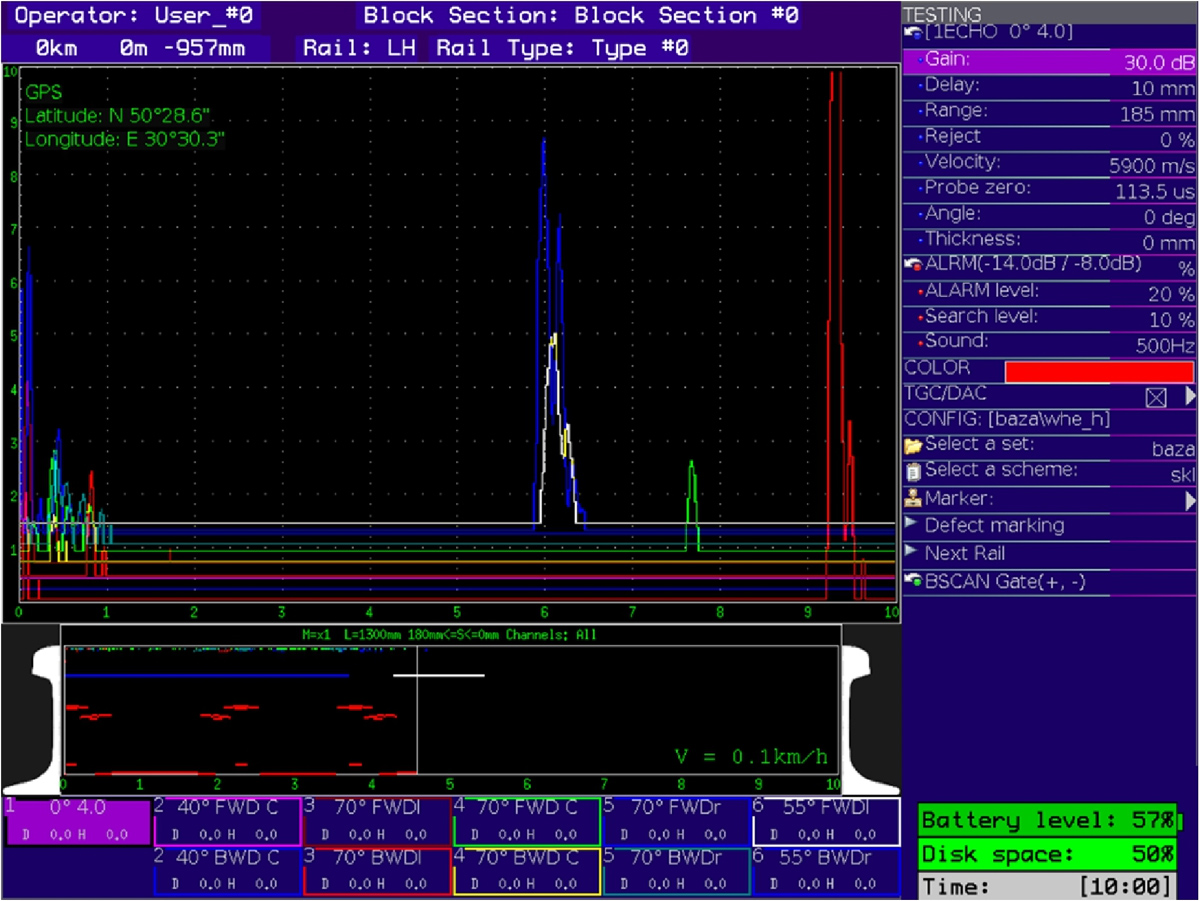 - Signaling about the presence of defects: sound, light, visual, indication of the set testing sensitivity values, defect coordinates, current track coordinate–digital on the screen built into the flaw detector.