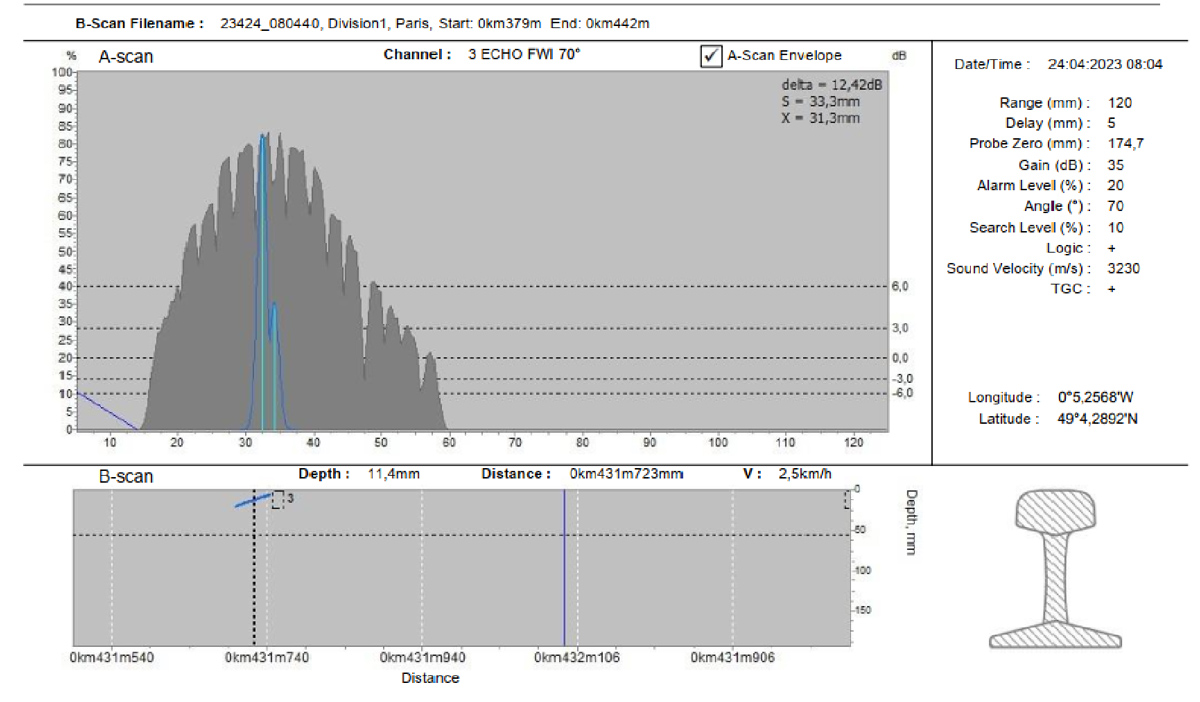 An example of one of the analytical reports created in post-processing using the Railinspector program.