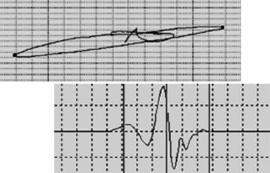 На рис. 2-4 представлены сигналы ВТП типа МДФ 1201 на рабочей частоте 170 кГц, которые наблюдаются на экране прибора ВД 3-71 в комплексной плоскости (а) и с временной разверткой (б). На рис. 2 представлены сигналы для трещины глубиной 0,6 мм с протяженностью 10 мм без применения дифференциальной обработки. На временной дефектограмме (рис. 2б) видны также сигналы помех, связанные с неровностями контролируемой поверхности.