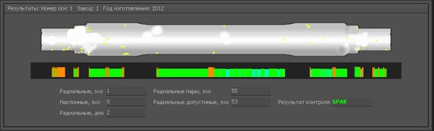 По окончании процесса система выдает заключение о годности в виде приведенного к оси Б-скана, обобщенных результатов и заключения «ГОДНО/БРАК» (рис.6). Сброс оси на позицию выгрузки также происходит нажатием кнопки «ВЫГРУЗКА».